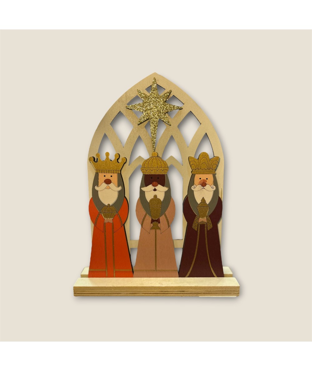 El diseño presenta a los Reyes enmarcados bajo un elegante arco de madera natural, creando un bonito efecto de profundidad. En la cima, una gran estrella dorada con purpurina brilla intensamente, guiando su camino.
