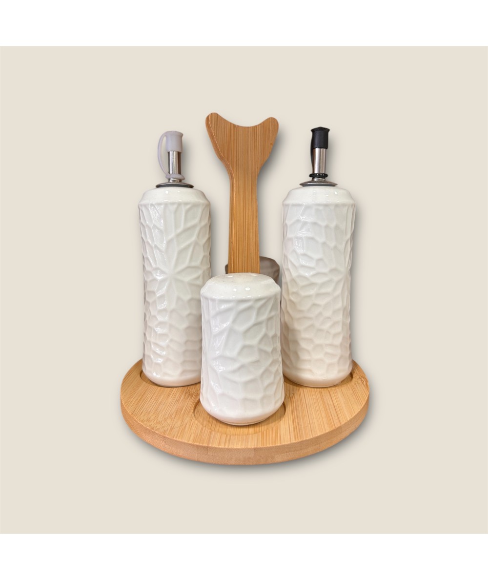 Combo de cocina compuesto por cuatro recipientes que se pueden ver en la foto, dos para líquidos y otros dos para sal y pimienta.