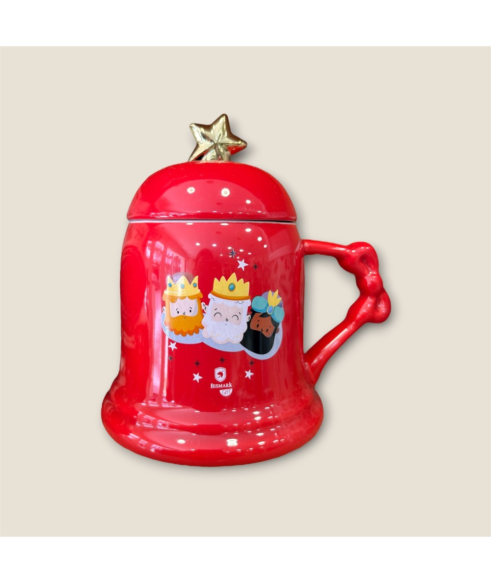 Su vibrante color rojo, su original forma de campana y la adorable ilustración del Melchor, Gaspar y Baltasar te llenarán de espirito navideño. Incluye una práctica tapa coronada con una estrella dorada, que es una cucharilla, para mantener tu bebida caliente y mágica.