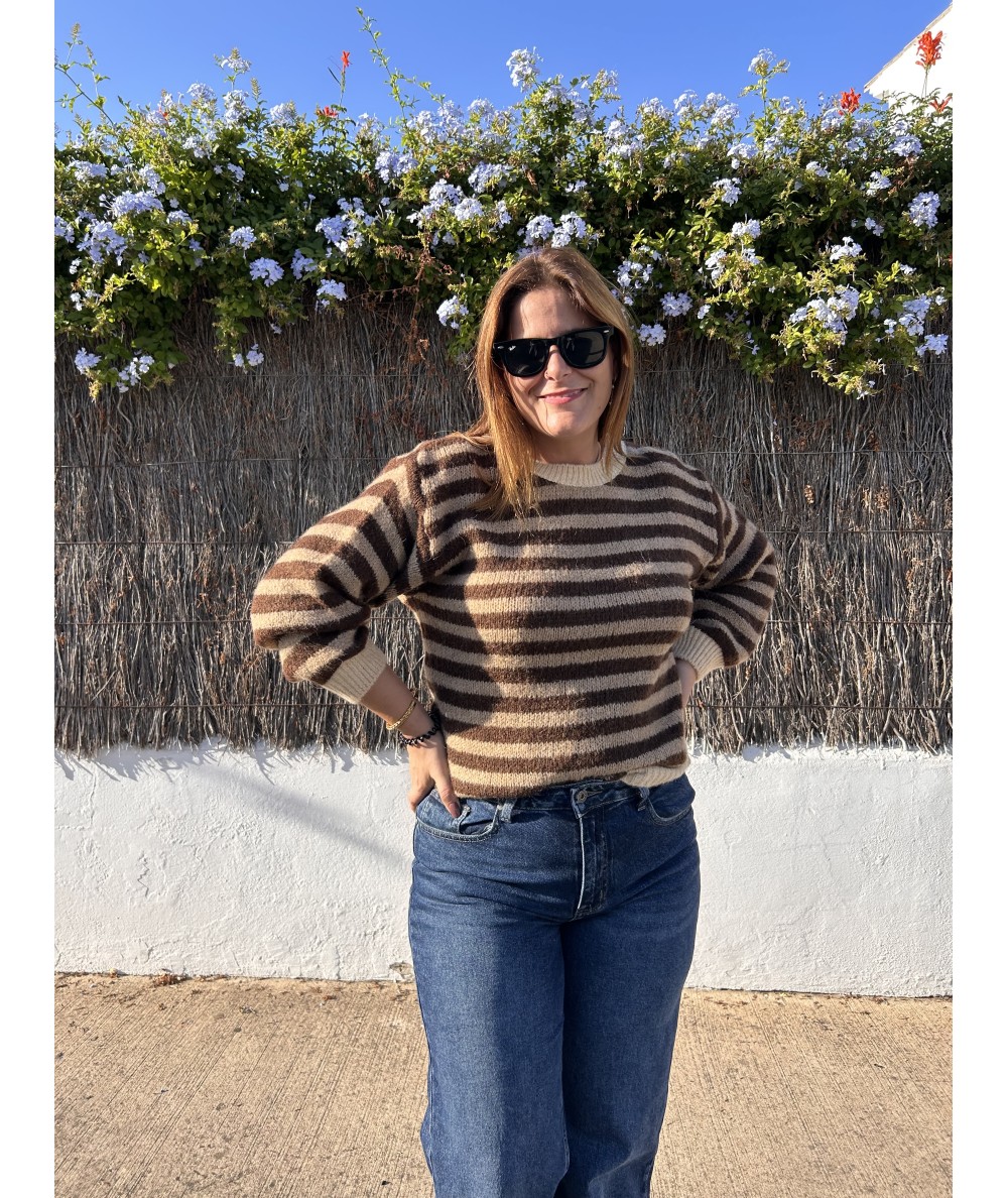 Este es un jersey marrón, con detalles en beige, y rayas horizontales. Es un jersey super divertido que dará una nueva dinámica a tu armario de invierno.